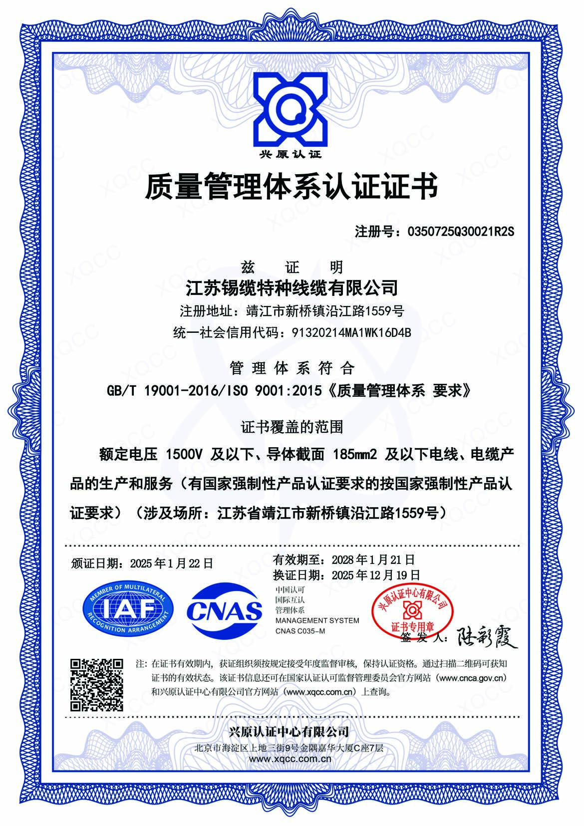質量管理體系認證證書
